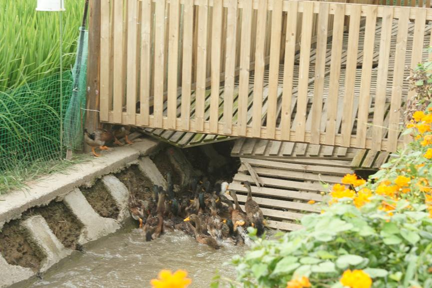 在“鸭蛙香稻”基地,长安村支书为队员们进行细致讲解。通过讲解得知,“鸭蛙香稻”即通过稻田养殖鸭蛙以及一系列物理、生物防治措施,可达到防治虫害作用,其最大的特点是纯天然、无农药、无化肥。这种创新方式也使得“鸭蛙香稻”口碑得到保障,大力提高其产品品牌效应与市场竞争力,继而成为现今长安村的标志性产业。