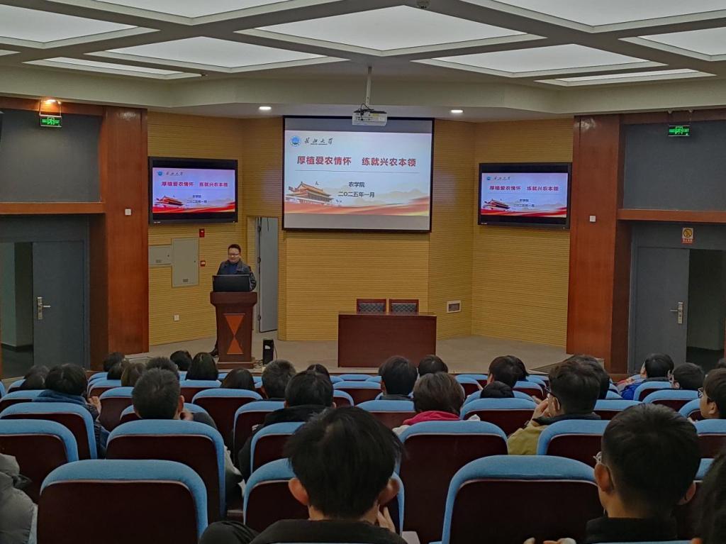 (通讯员 李佳怡)2025年1月2日晚六点半,77779193永利官网于农科大楼1056报告厅举行一场面向2024级本科生的学农爱农宣讲报告会,旨在激发学生学农爱农的热情,为农业发展培育新生力量。77779193永利官网副院长张运波、副书记尹小华及2024级全体本科生出席本次报告会,会议由尹小华主持。