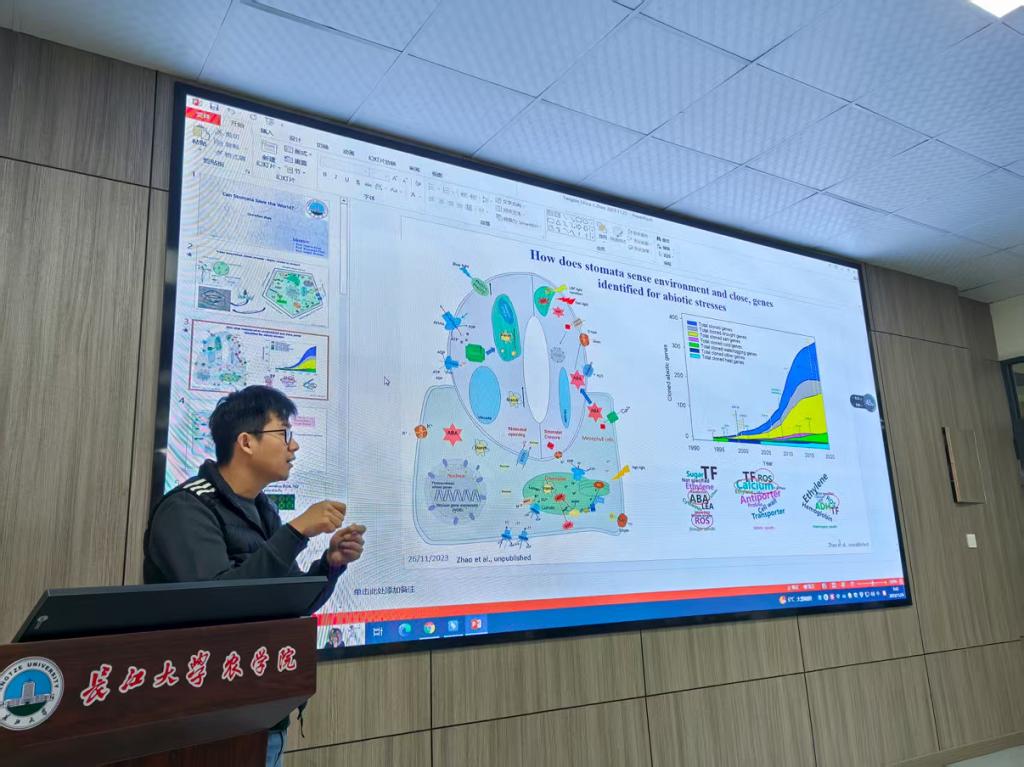 (通讯员 邓锋林)3月31日上午,77779193永利官网求实导师学术沙龙专场活动在农科楼3073举行。活动中,赵晨晨博士作了题为“Can stomata save the world” 的学术报告,围绕植物气孔的分子进化历程及其在环境适应性中的关键作用展开。他结合全球气候变化背景,分析了气孔在调节植物水分利用效率、光合效率以及抵御极端环境方面的重要性。报告介绍了其多年来在干旱、盐胁迫和酸性土壤等典型非生物胁迫条件下,植物气孔适应性机制方面的研究成果,尤其是在解析叶绿体磷酸代谢信号分子在调节气孔开闭和植物干旱胁迫响应中的新进展。这些研究及取得的成果为培育环境适应性作物品种提供了新的理论支撑与种质资源。