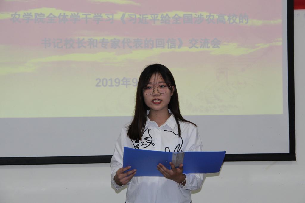 会议伊始,学生代表房康睿宣读《习近平给全国涉农高校的书记校长和专家代表的回信》。习近平总书记在回信中说到:“中国现代化离不开农业农村现代化,农业农村现代化的关键在科技、在人才。新时代,农村是充满希望的田野,是干事创业的广阔舞台,我国高等农林教育大有可为。”