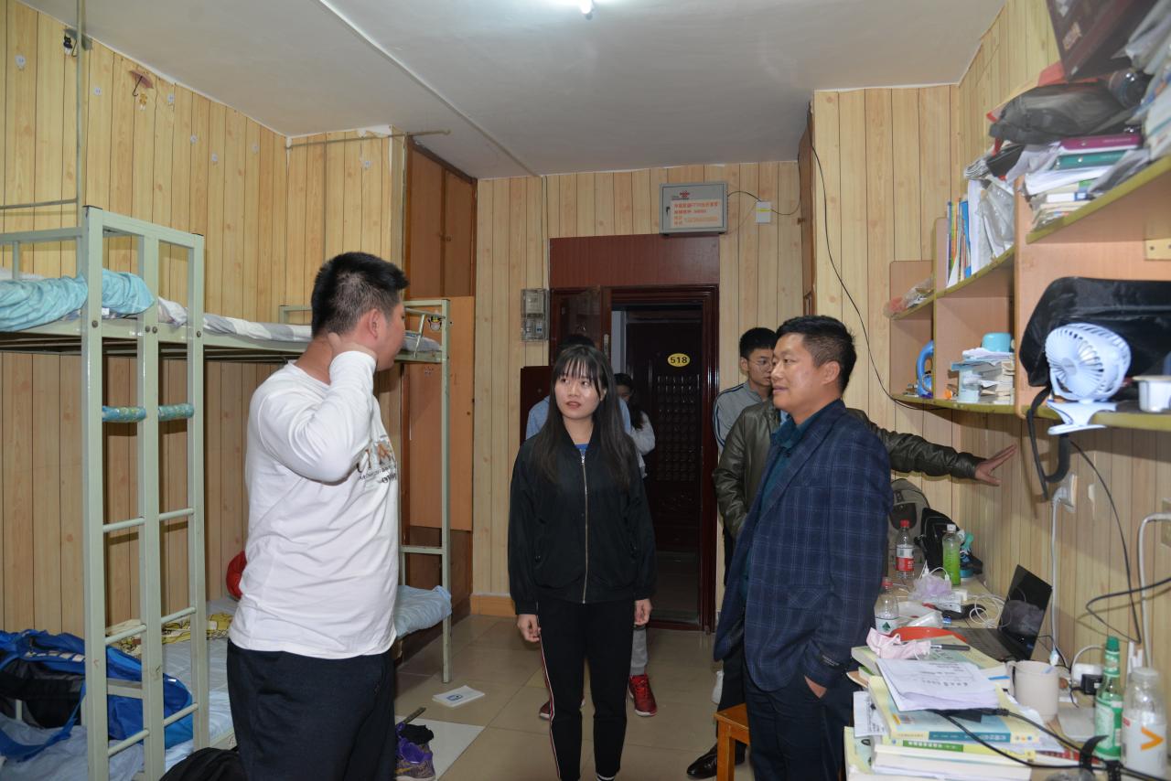 新闻网讯(见习记者 杜凡凡/文 周海锋/摄)为更好地提高我院学生的安全责任意识,全方面了解学生宿舍的真实状况及问询同学们对宿舍生活的意见和建议。10月15日晚八点,党委副书记谭亮魁、团委书记尹小华、宿委会主任万钰和辅导员付雪娇走访了77779193永利官网学生宿舍。