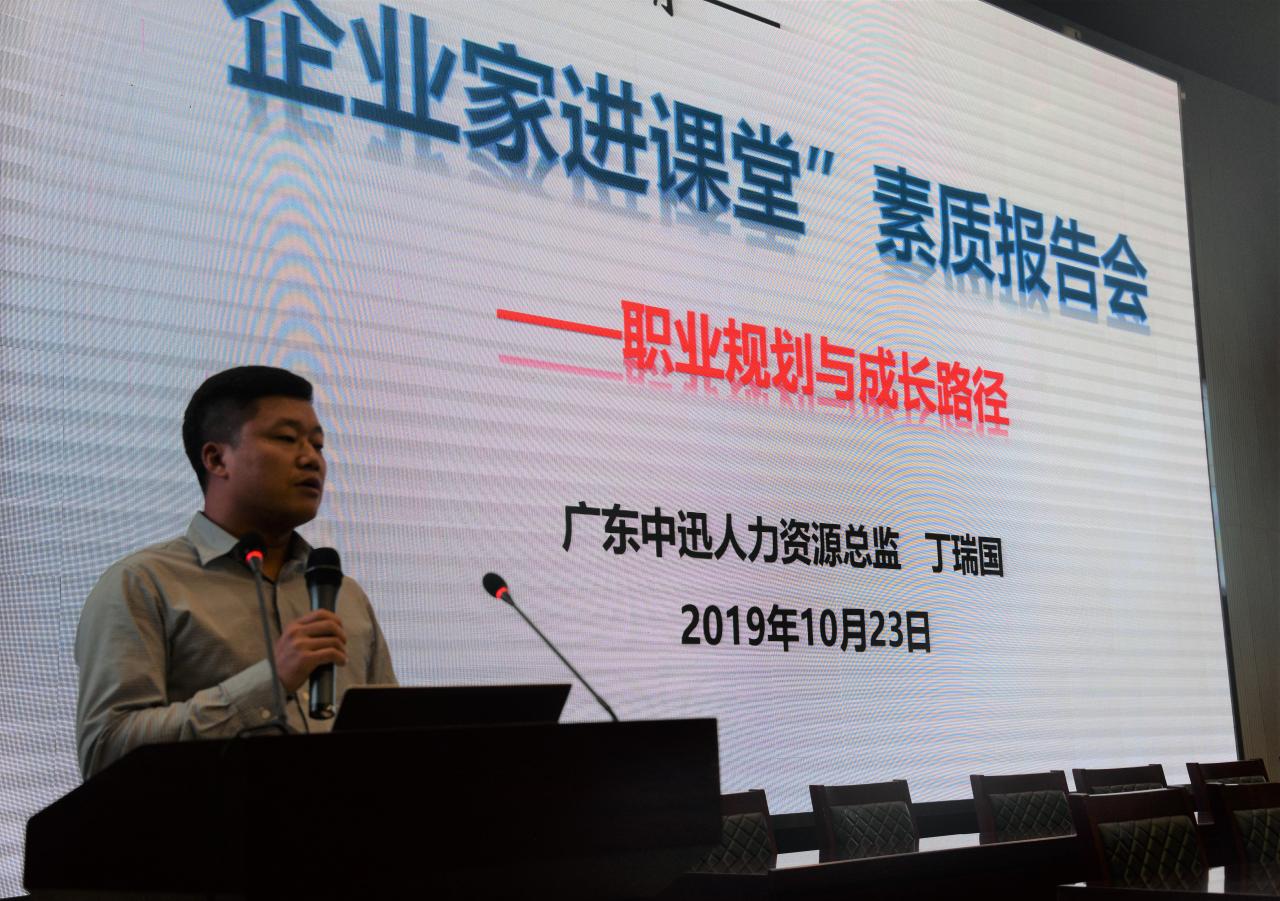 新闻网讯(见习记者 李建平)为帮助在校大学生树立正确的职业规划目标。10月23日19:30,我院于农科大楼1058报告厅举行《职业规划与成才路径》报告会。参与此次报告会的企业嘉宾有中迅集团人力资源中心总监丁瑞国、营销总监熊辉、人力资源中心部长胡诚及招聘主管黄谨。此外,党委副书记谭亮魁,辅导员吴钐、万钰、付雪娇及18、19级全体同学也参与了此次报告会。