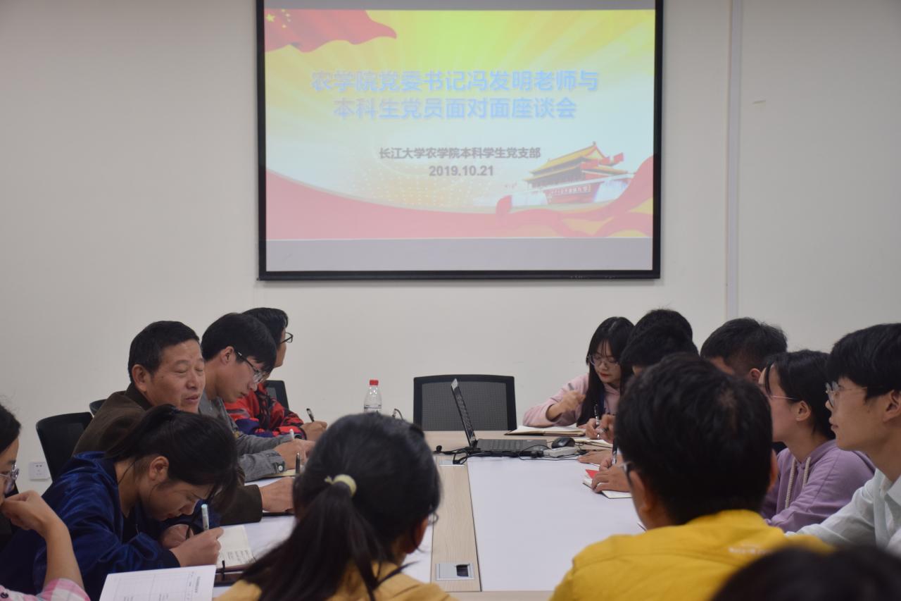 新闻网讯(学生记者 吴畅)10月21日晚19:00,我院党委书记冯发明在农科大楼3071与本科学生党支部全体党员及预备党员开展“不忘初心、牢记使命”主题教育调查研究座谈会。会议由兼职辅导员施秀飞主持。