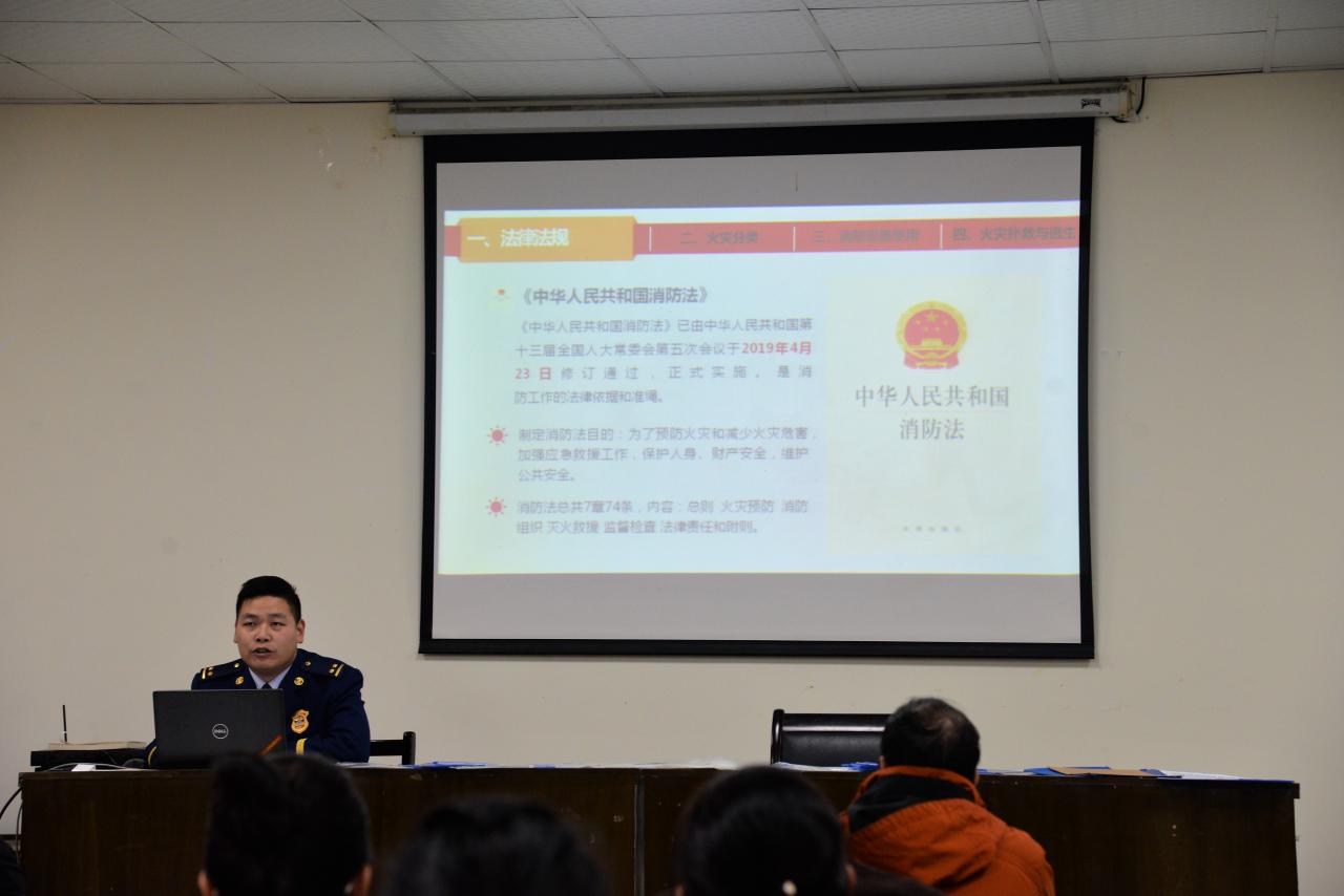 活动伊始,首先由来自荆州市消防支队的袁晗同志为全院教职员工做消防安全知识讲座。会上,袁晗同志从法律法规、消防常识、消防设施使用、火灾扑救与逃生四个方面为大家普及了消防安全知识。随后,他通过PPT演讲的形式使大家详细了解到国家有关消防法律、法规,熟悉防火、灭火知识,火场逃生知识。活动最后,全体教师和学生代表进行了模拟灭火消防演练,教师和学生都积极尝试使用灭火器,并熟练掌握了灭火器的使用方法,增强了师生们的灭火器使用、扑救初起火灾、组织疏散逃生等基本能力。