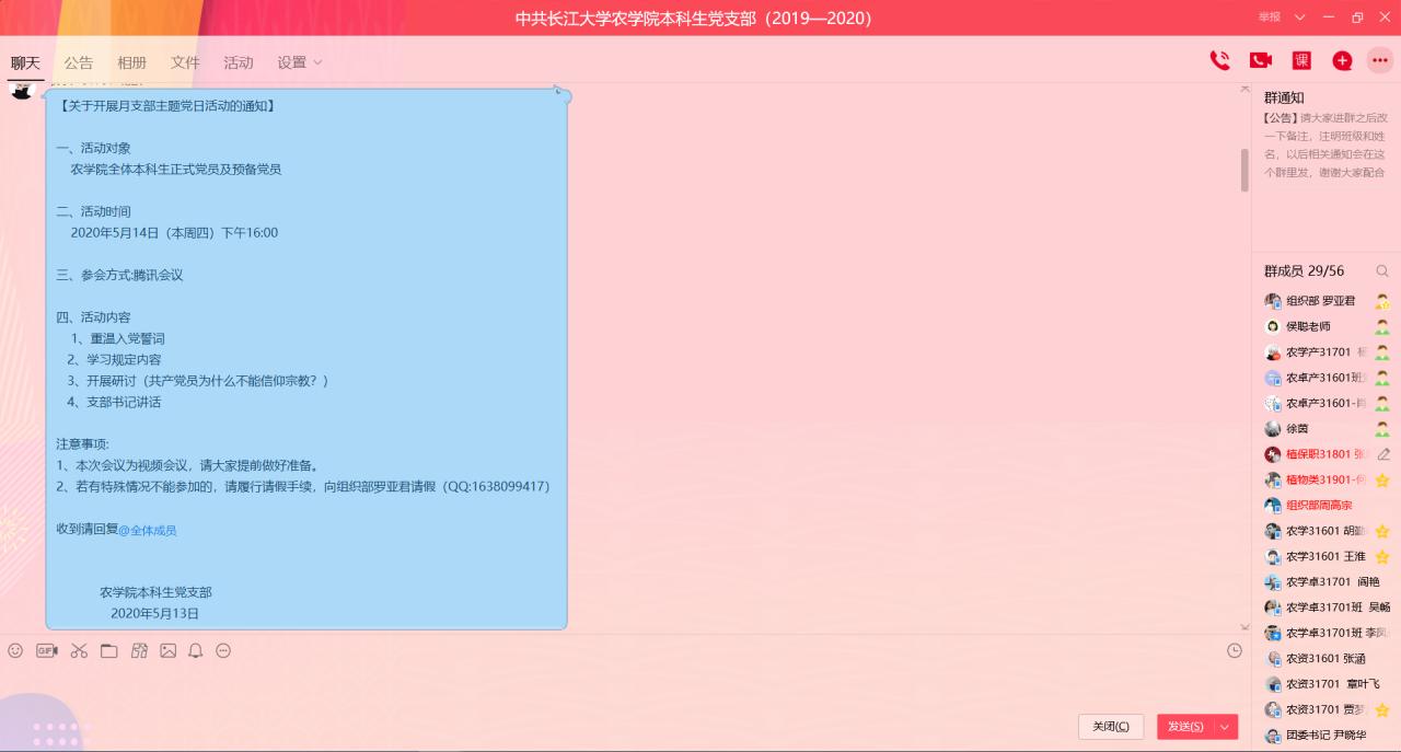 通讯社讯(学生记者 张毅)为引导广大党员用马克思主义立场、观点、方法认识和对待宗教,坚定共产主义信仰和中国特色社会主义信念,我院本科生党支部于5月14日16:00通过QQ群视频通话的方式开展了线上支部主题党日活动。此次活动由77779193永利官网本科生党支部宣传委员杨欧主持,全体本科生正式党员以及预备党员参与此次活动。