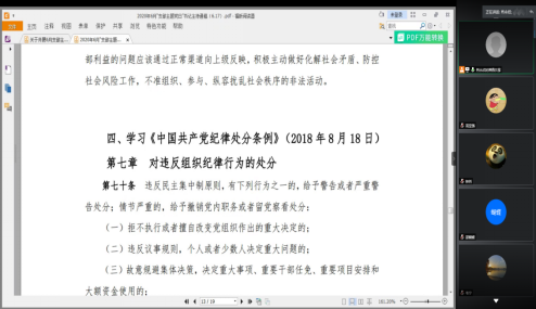 通讯社讯(通讯员 高亚强 周志雄)为深入学习贯彻习近平总书记重要讲话及有关文件精神,引导和激励广大党员履职尽责,奋发有为,我院研究生第二党支部于6月23日下午通过腾讯会议,线上开展了6月份支部主题党日活动。全体正式党员及预备党员参与此次活动,会议由支部副书记肖永欣主持。