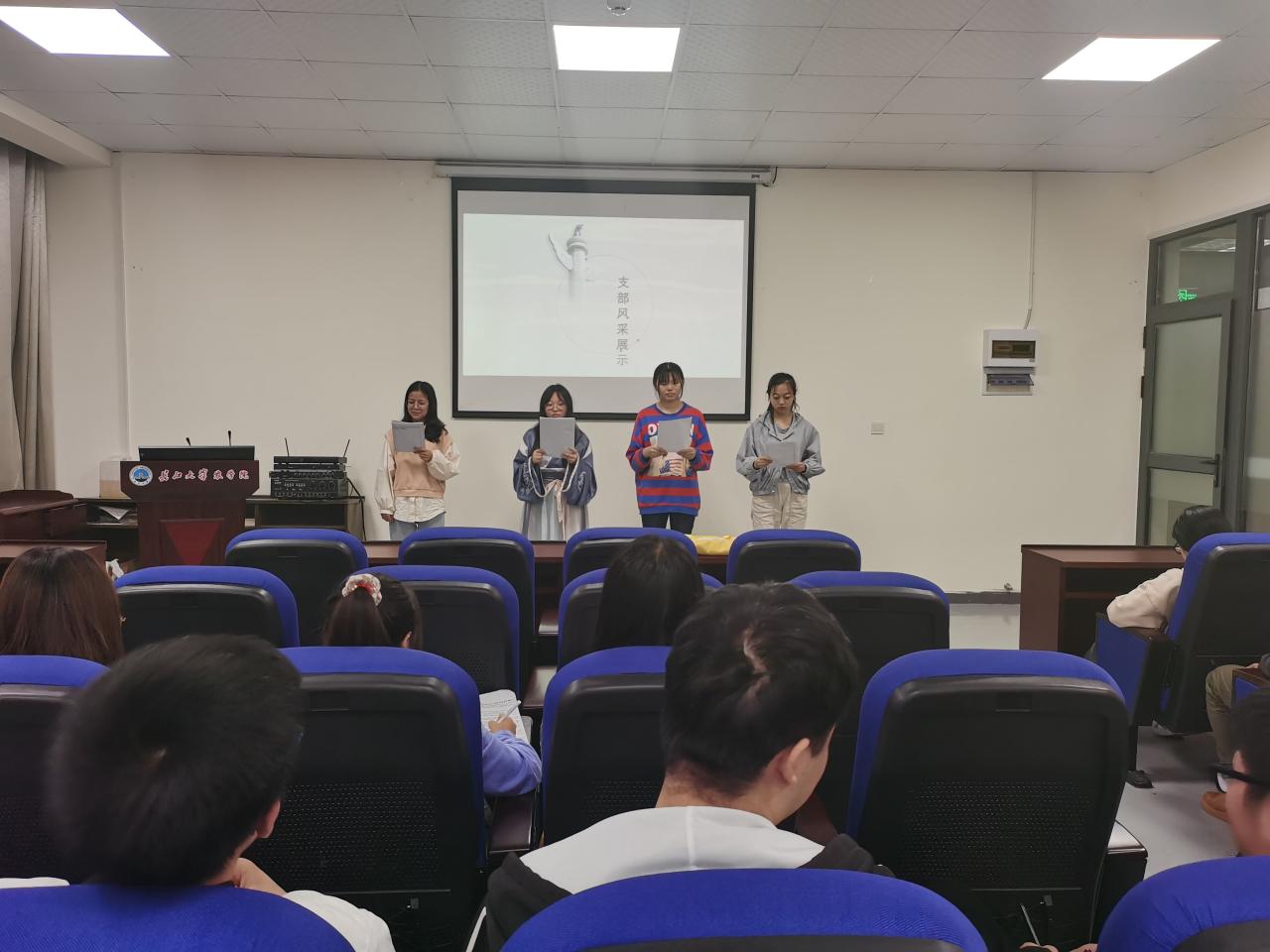 此外,农资31801班还开展了“百生讲坛”活力团支部建设主题班会。会上,主持人邹宇傲主要从班级概况、学习创新、学习成果介绍三个方面向同学们展开讲述。他首先从班训和班歌方面阐述了本班的支部文化。随后,他以班级平均绩点、课程通过率、四六级通过率为切入点,提醒同学们要向身边优秀的同学看齐,并努力提升自己。最后,他表示本班支部尤其注重学习工程,按学校学院的要求,每月都会进行相关材料的集中学习。今后支部也将积极开展理想信念、社会主义核心价值观主题宣传教育活动,认真学习贯彻习近平新时代中国特色社会主义思想和党的十九大精神,并引导团员学生增强“四个意识”,坚定“四个自信”,坚决做到“两个维护”。