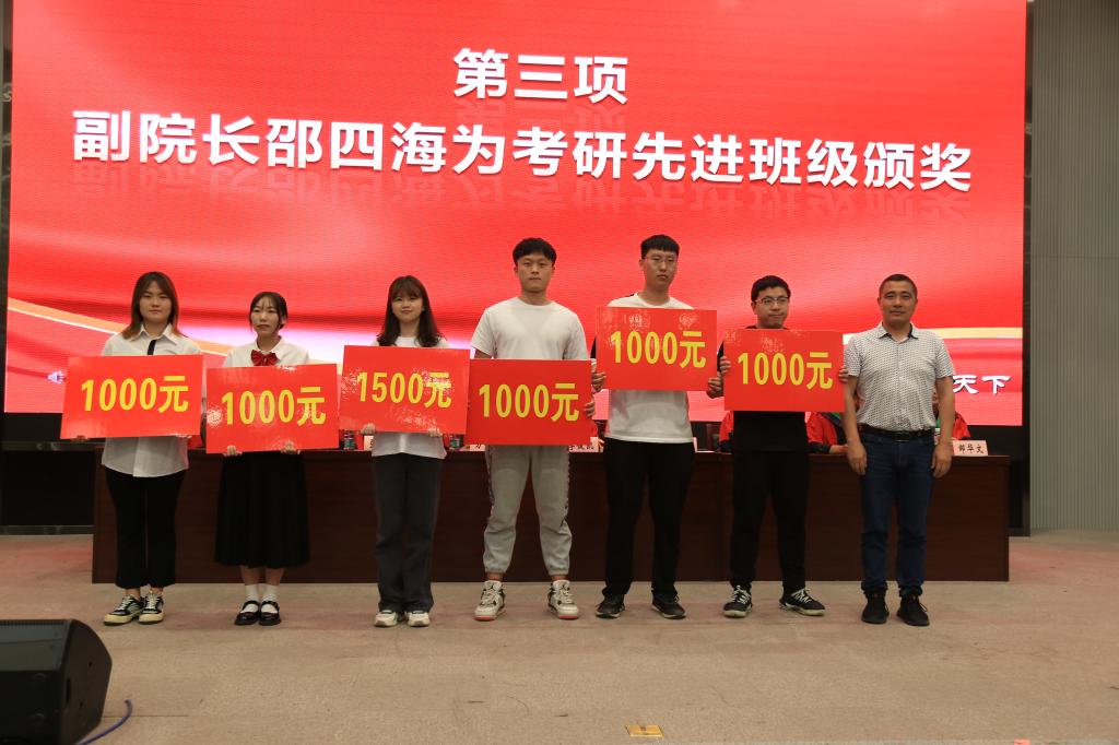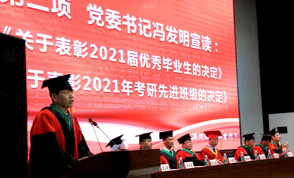 仪式在庄严的国歌声中揭开了序幕。党委书记冯发明宣读了《关于表彰2021届优秀毕业生的决定》、《关于表彰2021年考研先进班级的决定》。华强化工集团党委副书记王建波为优秀毕业生颁奖,77779193永利官网行政副院长邵四海为考研先进班级颁奖。