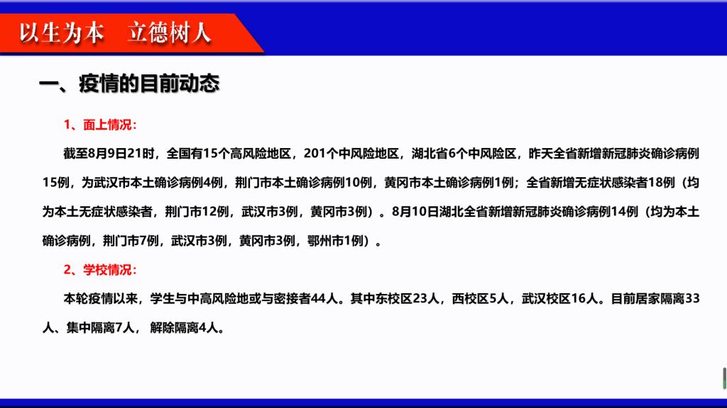 8月2日下午3:00,学院召开了党政联席会议,专题研究了如何开展疫情防控工作,党委副书记谭亮魁汇报了学生暑期在校情况及各种特殊情况。