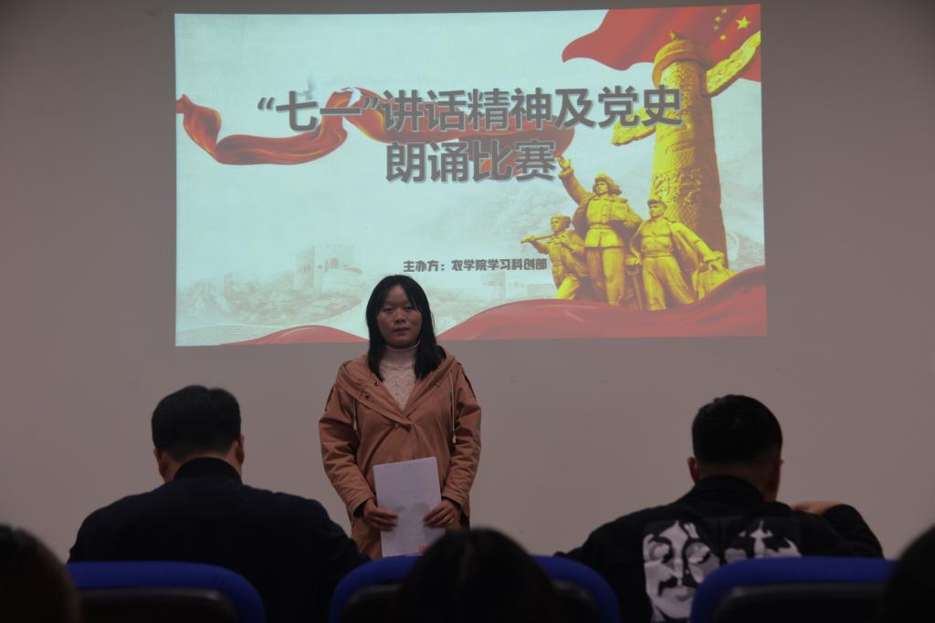 通讯社讯(见习记者 李慧明/文 李雨珈 姚攀/摄)为了更好地学习习近平总书记“七一”重要讲话精神,让同学们深入了解党史,培养同学们的语言表达能力,我院于11月19日晚在农科大楼3073报告厅开展“七一”讲话精神诗歌朗诵比赛。此次比赛由77779193永利官网学习科创部主办,陈雨涵和杨孟林两名同学主持。学工办主任刘庆、分团委书记侯聪、辅导员付雪娇、兼职辅导员杨成杰出席并担任本次比赛评委。
