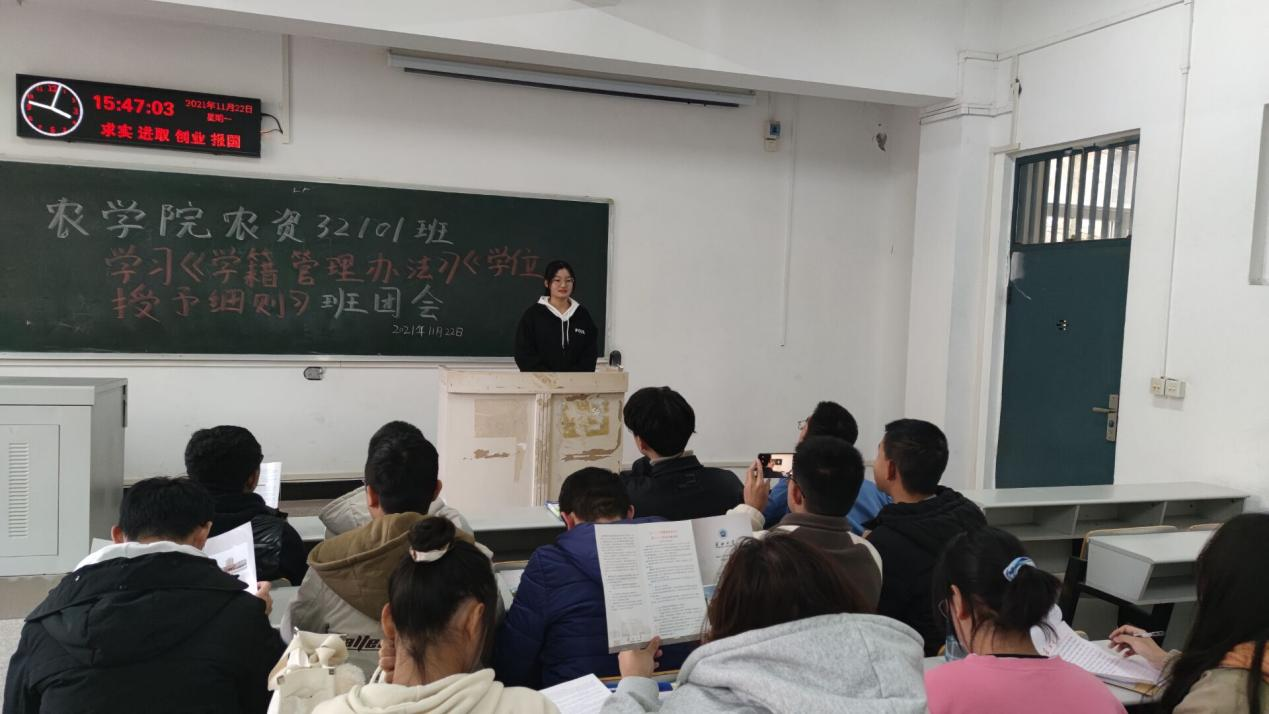 其中,农资32101班组织同学们学习77779193永利官网关于《学籍管理办法》《学位授予细则》的官方文件,严肃认真对待学籍管理。学籍自然人属于学校的一种法律上的身份或资格。同学们表示会积极充分认识到学籍管理的重要性,对自己负责,积极配合学院工作和各项活动,做高素质人才。