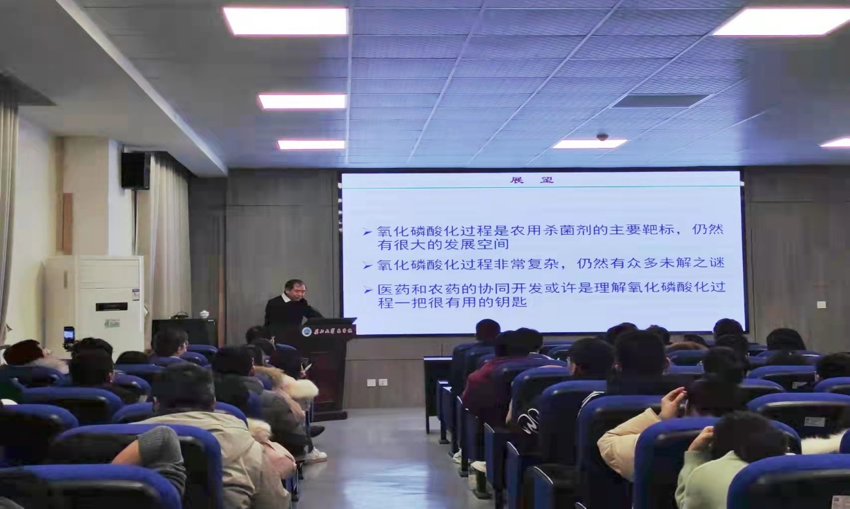 (通讯员 常璐)12月28日下午15:30,应学院邀请,由李俊凯院长主持,覃兆海教授在农科大楼3073学术报告厅作《有关线粒体靶向杀菌设计与开发》学术报告。参与本次报告的嘉宾老师有杜晓英老师,杜亚楠老师,马东方老师,尹军良老师,张小磊老师,徐志红老师,陈旺老师等。