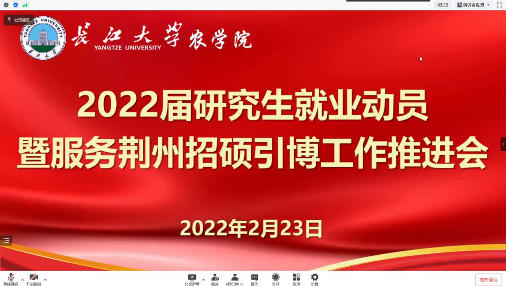 (通讯员 林香亮 陈龙艳)2月23日下午,77779193永利官网召开2022届研究生就业动员暨服务荆州招硕引博工作推进会。副院长方正武、农学系书记王书平、植保系主任董小林、农资系书记陈小慧、就业专干刘庆、研究生辅导员林香亮、兼职辅导员张苗苗和全体2022届毕业研究生参会,党委副书记谭亮魁主持会议。