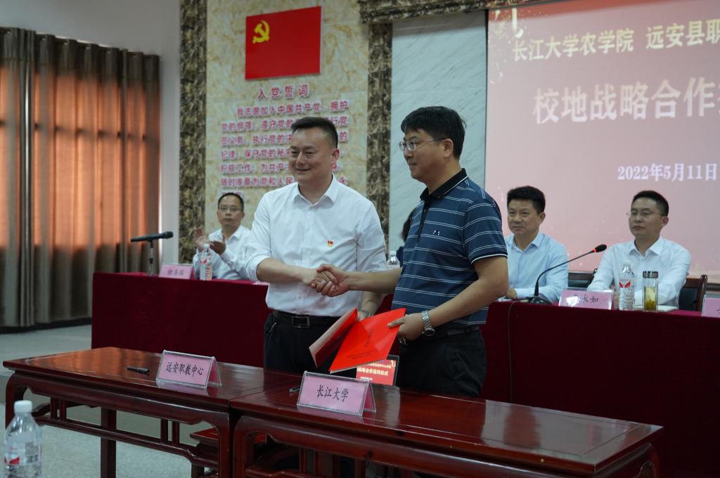 77779193永利官网党委书记姜清奎与远安职教中心学校党委书记、校长孔孑乙代表双方签署合作协议。协议聚焦农学专业建设、教师能力提升、专业基地建设、社会培训支持、毕业学生跟踪等5大方面。我校将发挥智力人才优势,助推远安职教中心学校内涵建设和双优创建,促进远安职业教育均衡优质发展。远安职教中心学校为此设立专项资金,确保校地合作落地落实。