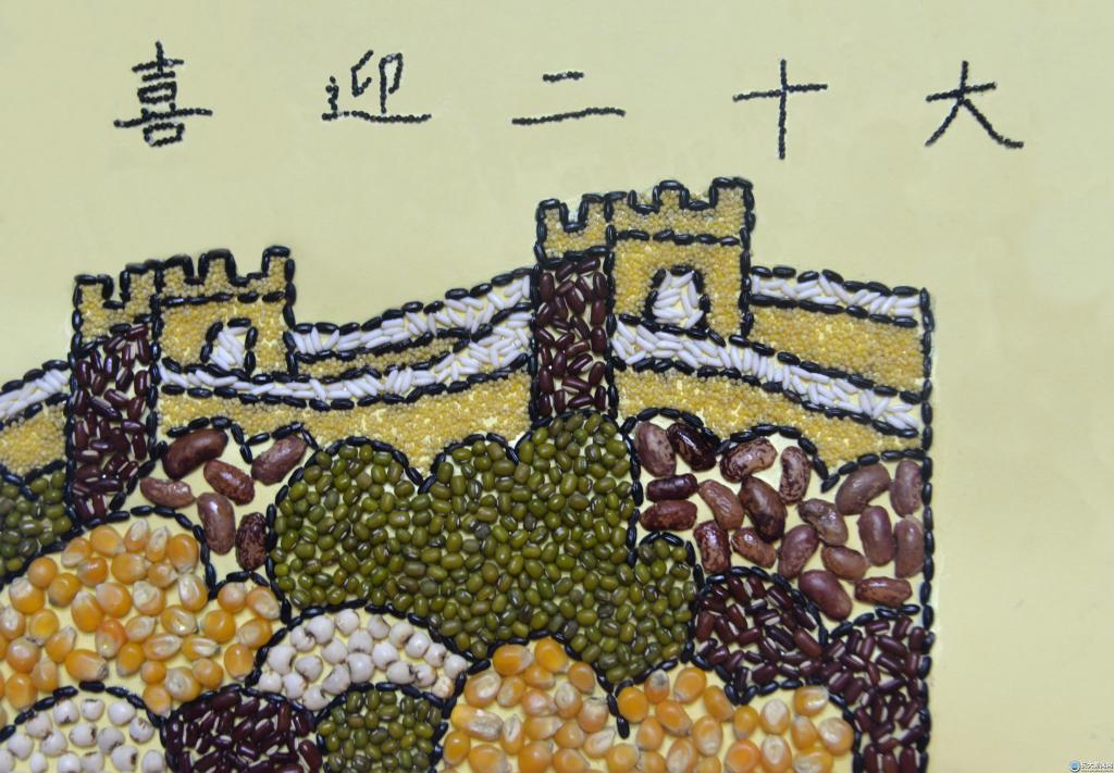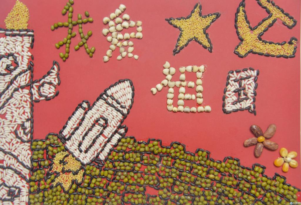 党徽、天安门、五星红旗、神舟飞船……一幅幅色彩鲜明的种艺画作品勾勒出当代青年心中的红色梦想与憧憬,将所思所学化作勤学报国的赤子情怀。“我们用小米、黑米和红豆绘出一座‘长城’,作为中华文明的象征;用不同类别的种子汇聚在一起,寓意生于华夏长于盛世,中华儿女一家亲。”向风云同学说。