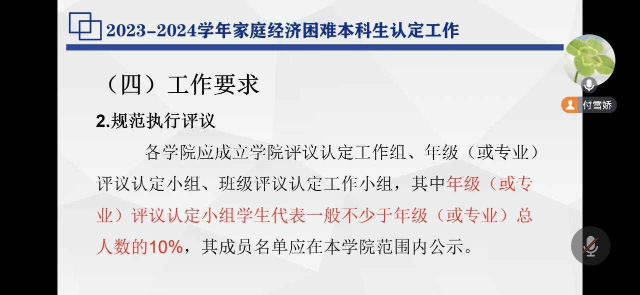 (通讯员 曾恺怡)为做好我院普通家庭经济困难学生认定工作,全面落实资助政策,做到有效资助,确保家庭经济困难学生能顺利入库,近日,我院召开了家庭经济困难本科生认定工作政策宣讲会。会议分为学院政策宣讲会和班级宣讲会,结合线上和线下的方式开展,党委副书记尹小华、资助专干付雪娇、全体班主任及全体班委参加此次会议。会议由付雪娇老师主持。