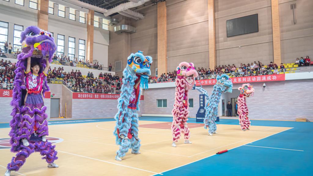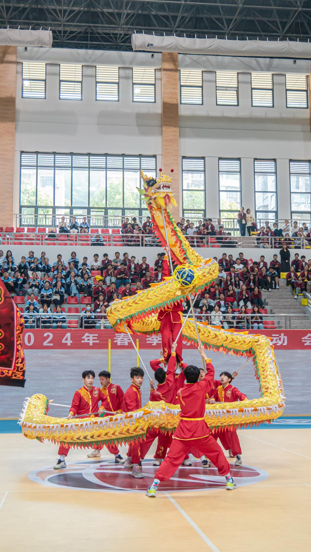 伴随着铿锵有力的音乐响起,金色长龙翻腾起舞,气势如虹,六只狮子“摇头摆尾”、“眨眼扇耳”,腾挪跳跃、威风凛凛,我校龙狮队为现场师生精彩表演《龙腾狮跃》,赢得了现场阵阵喝彩。