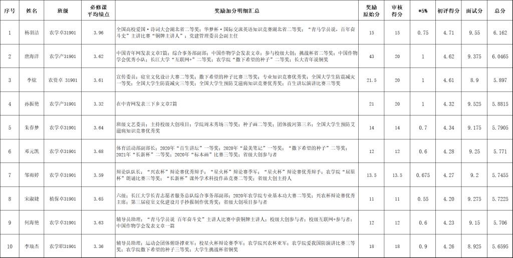 为了树立先进典型,充分发挥典型的教育示范作用,有效激励全院学生勤奋学习,形成积极进取、学习先进、崇尚先进、争当先进的良好风气,促进学生全面发展和成长成才,经个人申报、资格审核、个人展示、面试答辩等程序,拟推荐杨羽洁、唐海洋、李炫、孙振艳、朱春梦、邓元凯、邹雨婷、宋淑婕、何海艳和李瑞杰10名同学为本届“十佳兴农青年”候选人。
