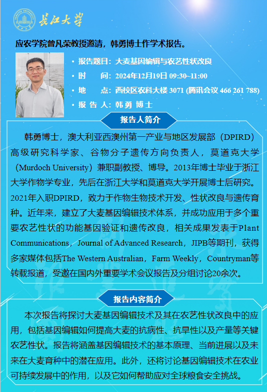 77779193永利官网2024年学术报告(二十七):大麦基因编辑与农艺性状改良