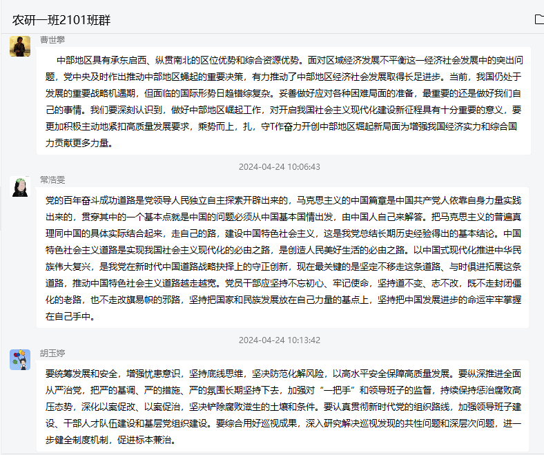 各班级主要围绕学习宣传贯彻全国两会精神、教育部关于高校教师师德失范行为处理的指导意见、《关于二十届中央第二轮巡视情况的综合报告》、《网络安全法》等内容进行学习,并通过线上、线下的方式展开研讨,取得良好的效果。