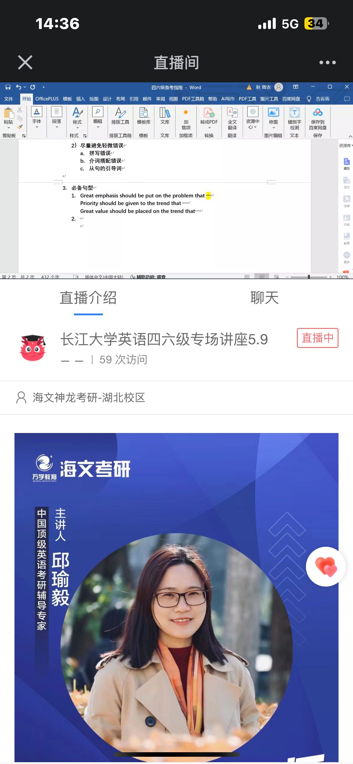 (通讯员 杨梦瑶)为激发我院学子对英语的学习兴趣,丰富知识储备,提高英语素养,分享英语学习经验,为备考英语等级考试筑牢基础,近日,我院于2024年5月10日线上开展“英语四六级”主题讲座,此次讲座由中国顶级考研英语辅导专家邱瑜毅主讲。