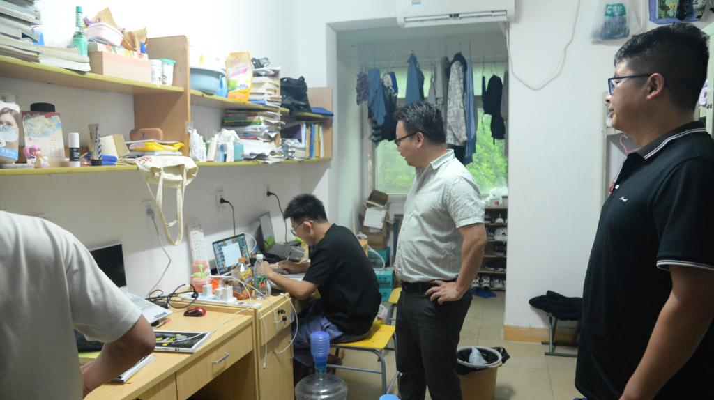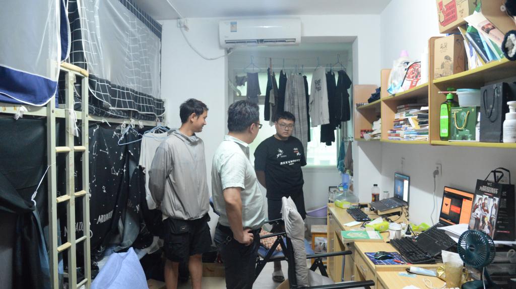 此次检查针对宿舍卫生和学习氛围两个问题进行。尹书记强调在宿舍要注重学习氛围,同学们应该逐步着手备战考研。另外,要注重宿舍卫生,保持宿舍干净整洁,无异味。