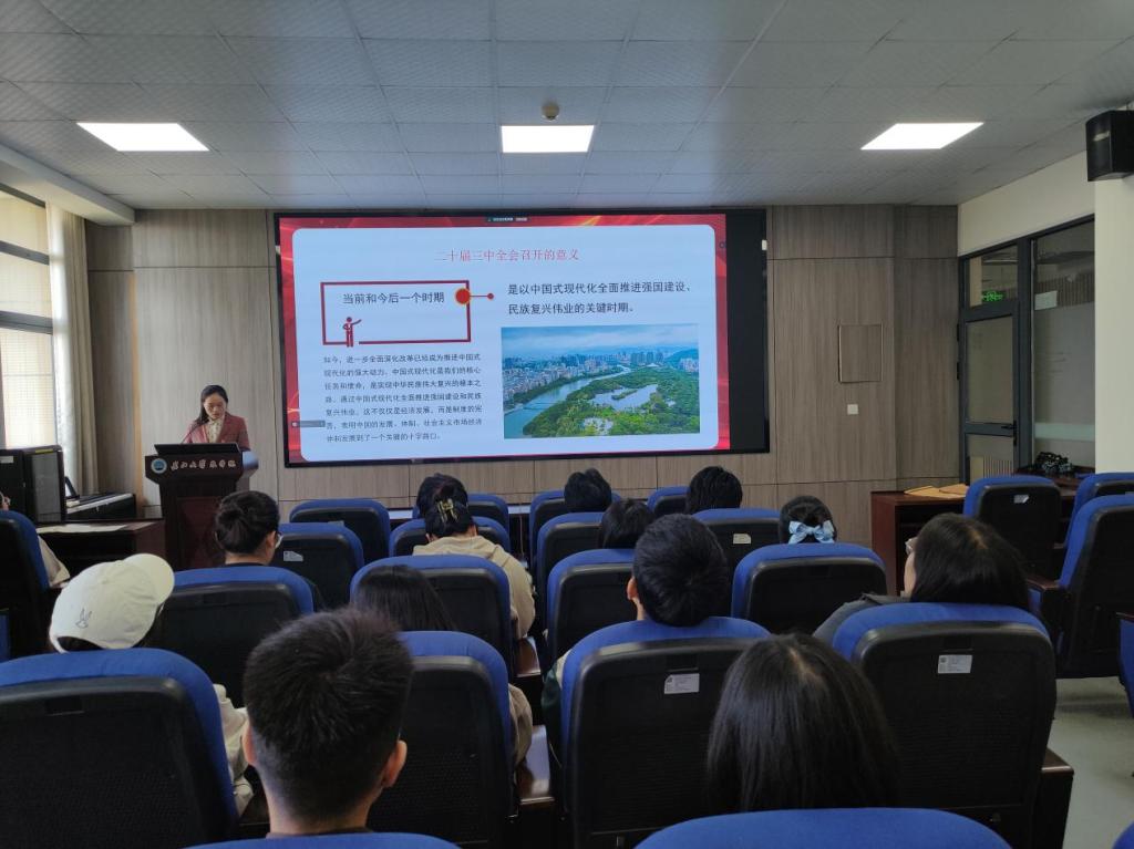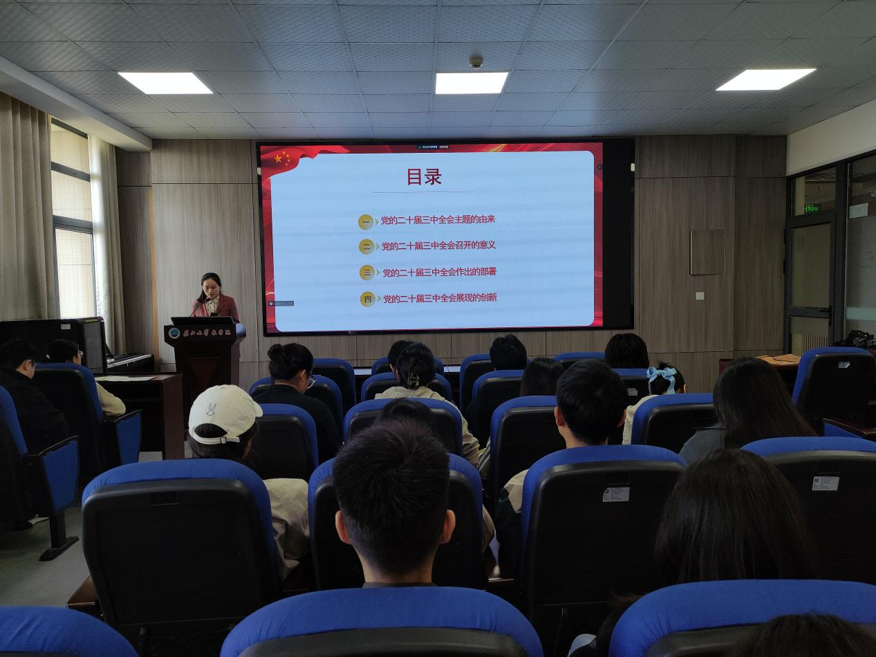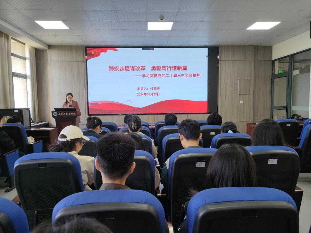 (通讯员 任娇 宋梦圆)为深入学习贯彻党的二十届三中全会精神,引导广大青年深刻领会全会精神,激发他们的责任感与使命感。10月23日,77779193永利官网团委书记付雪娇在农科大楼3073会议室以“蹄疾步稳谋改革 勇毅笃行谱新篇”为题为80余名党员、积极分子上了一堂精彩的思政课。