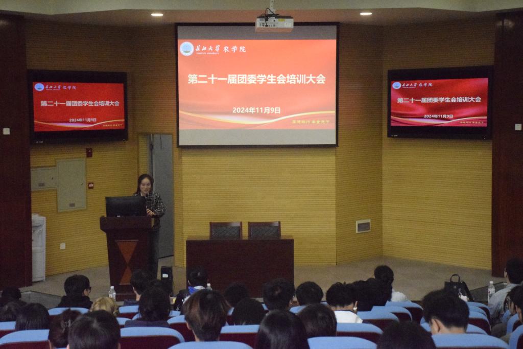 (见习记者 严树彬 向建华/文 何遥 徐馨悦/摄)为进一步加强学生干部队伍建设,提高学生干部的工作能力和服务水平,11月9日下午,我院在农科大楼1056报告厅开展了第二十一届团委学生会培训大会,学院党委副书记尹小华、校友金骋怀、范如旖及全体学生干部、各班团支部委员参加本次培训大会,会议由团委书记付雪娇主持。