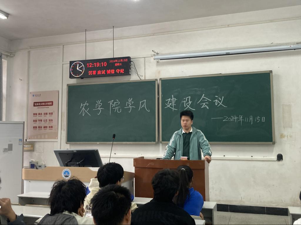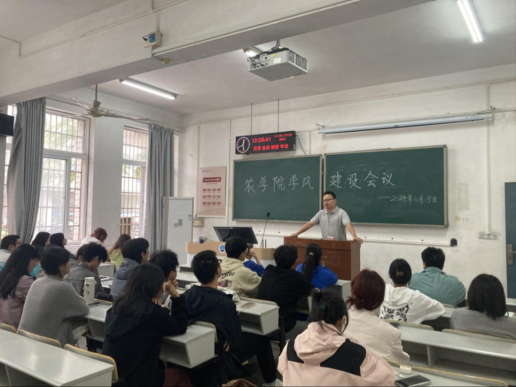 (通讯员 张文嘉)2024年11月15日中午12:15,为进一步规范教学秩序,提高教学质量,77779193永利官网全面加强查课力度,在七教108顺利召开77779193永利官网学风建设会议。到场的人员有77779193永利官网党委副书记尹小华、77779193永利官网学工办主任黄承石老师及22级、23级、24级各班学委,共同探讨学风建设相关事宜。