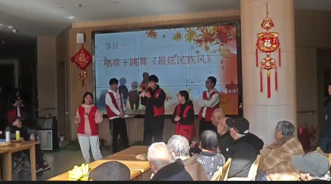 敬老院的活动室,文艺表演精彩纷呈。在主持人的介绍下,第一个节目——《最炫民族风》登上舞台。同学们嘹亮的歌声和欢快的舞蹈让老人们目不暇接,忍俊不禁。第二个节目——《魔术表演》既给老人们参与感,又带来惊喜与欢乐,令人拍手叫好。第三个节目是奶奶们带来的《我的母亲我的祖国》,她们的歌声中饱含对祖国的热爱与骄傲,引起全体人员的共鸣,大家跟着节奏轻拍手掌、小声哼唱。节目过后是游戏环节,抛球游戏、击鼓传花给大家带来欢声笑语,同时让同学们见识到爷爷奶奶们的多才多艺。接着,志愿者们与爷爷奶奶们合作剪纸,创作出一个又一个精美图案。最后,全体志愿者合影留念。在拍照过程中,一位老爷爷用浑厚坚定的歌声向志愿者们表达送别与祝愿。