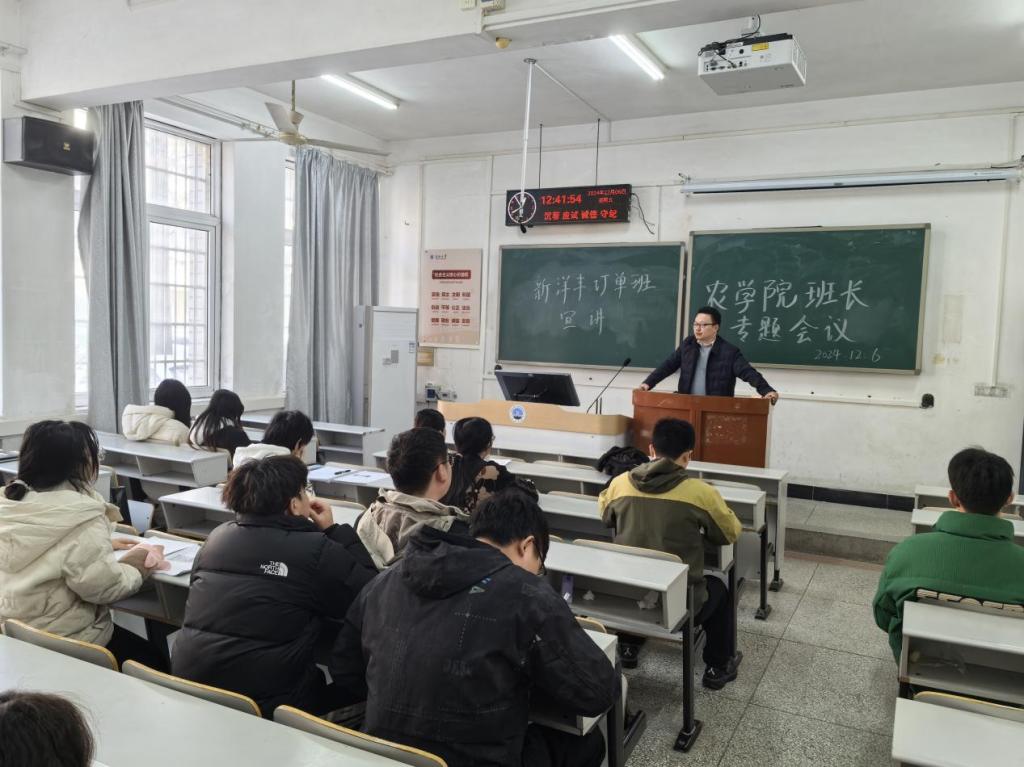 针对新洋丰订单班的宣讲。新洋丰是一家知名的农业企业,此次与学院合作开展订单班,旨在培养具有专业技能和实践经验的农业人才,提供企业实习、就业等机会。学院鼓励同学们积极参与订单班的选拔,为自己的职业规划打下坚实基础。订单班不仅为同学们提供了优质的学习资源和就业机会,还能够帮助同学们更好地了解行业趋势和市场需求,为未来的职业发展指明方向。各班级班长也表示,将积极向同学们传达订单班的相关信息,鼓励符合条件的同学积极参与选拔。