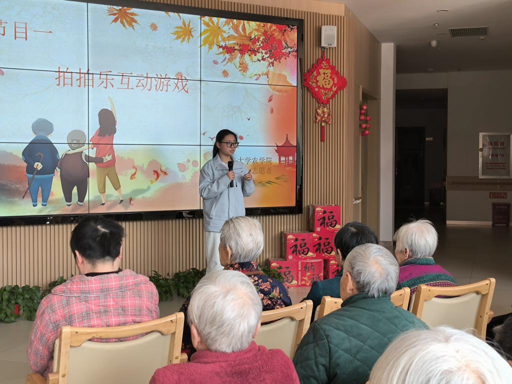 为了给老人们带来欢乐,同学们还精心准备了文艺表演和欢乐的小游戏,在节目开始前,社会实践部的成员们为爷爷奶奶们带来一个热场小游戏,社会实践部的成员详细的讲解了欢乐拍拍乐的游戏规则,通过生动的演示,让老人们迅速熟悉了游戏玩法,随着欢快的背景音乐响起,现场气氛迅速升温,在游戏过程中,老人们全神贯注,积极反应,每一次成功的拍打都赢得周围伙伴们的阵阵掌声与欢呼。大家在欢乐的氛围中尽情享受着游戏带来的乐趣,欢声笑语回荡在整个活动场地;接着植物类4班小伙伴带来的“击鼓传花”游戏将活动推向高潮,音乐响起,老人们目光紧随着水瓶,脸上满是紧张与期待,随着节奏快速传递手中的水瓶。当音乐戛然而止,拿到水瓶的老人大方起身,一展歌喉,唱起经典老歌,唤起大家的往昔回忆。现场掌声、欢笑声此起彼伏,每一次传递都是温暖互动,每一次表演都是情感交流;最后青马小组的成员还为我们带来了神奇变幻的魔术,让爷爷奶奶们惊叹连连,为爷爷奶奶们带来了一场视觉盛宴。