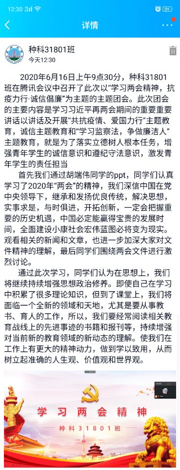 其中,种科31801班通过观看胡端伟同学的ppt,学习了两会精神,同学们认为在思想上,我们将继续持续增强思想政治修养。即使自己在学习中积累了很多理论知识,但到了社会上,我们将面临一个全新的领域和天地。班长认为其关键就在于我们个人是否能够始终如一地坚持信念,是否能够满怀兢兢业业的工作态度。