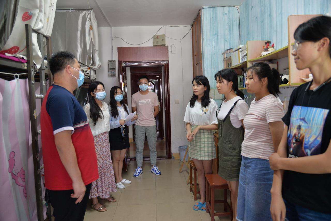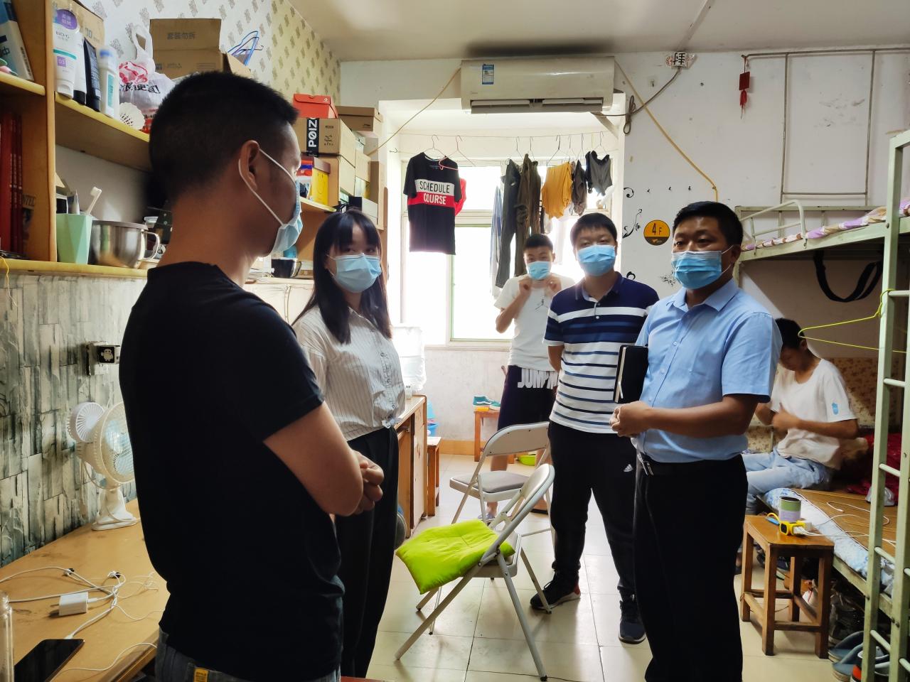 通讯社讯(学生记者 覃杨)为进一步强化疫情防控期间返校学生的健康安全防范意识,营造良好的寝室卫生环境,了解返校后学生的生活学习状况,9月3日14:00,77779193永利官网副院长方正武、党委副书记谭亮魁、学工办主任刘庆、分团委书记侯聪、辅导员付雪娇及辅导员林香亮带队走访了77779193永利官网本科生寝室。