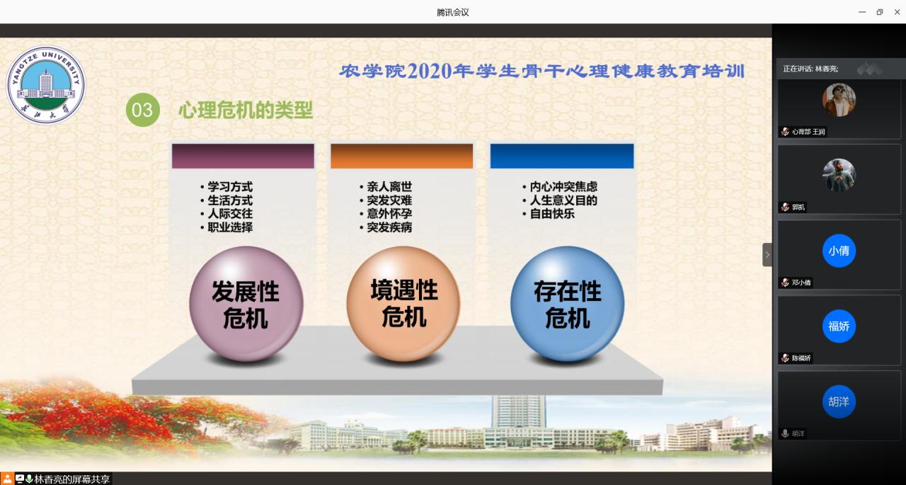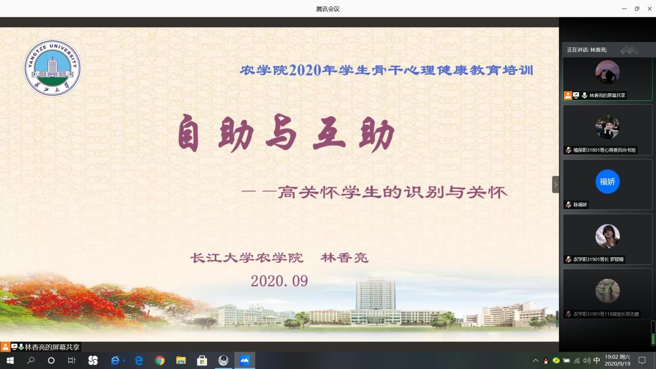 通讯社讯(学生记者 罗旖柔 黄俊杰)为做好秋季开学后学生心理健康教育工作,落实常态化疫情防控形势下的心理适应,提升学生骨干自助与互助水平,9月19日晚7时,77779193永利官网利用腾讯会议线上开展2020下半年学生骨干心理健康培训。此次培训由学院心理专干林香亮老师主讲,本科生、研究生班级班长、团支书、心理委员、安全委员、寝室长参与此次培训。
