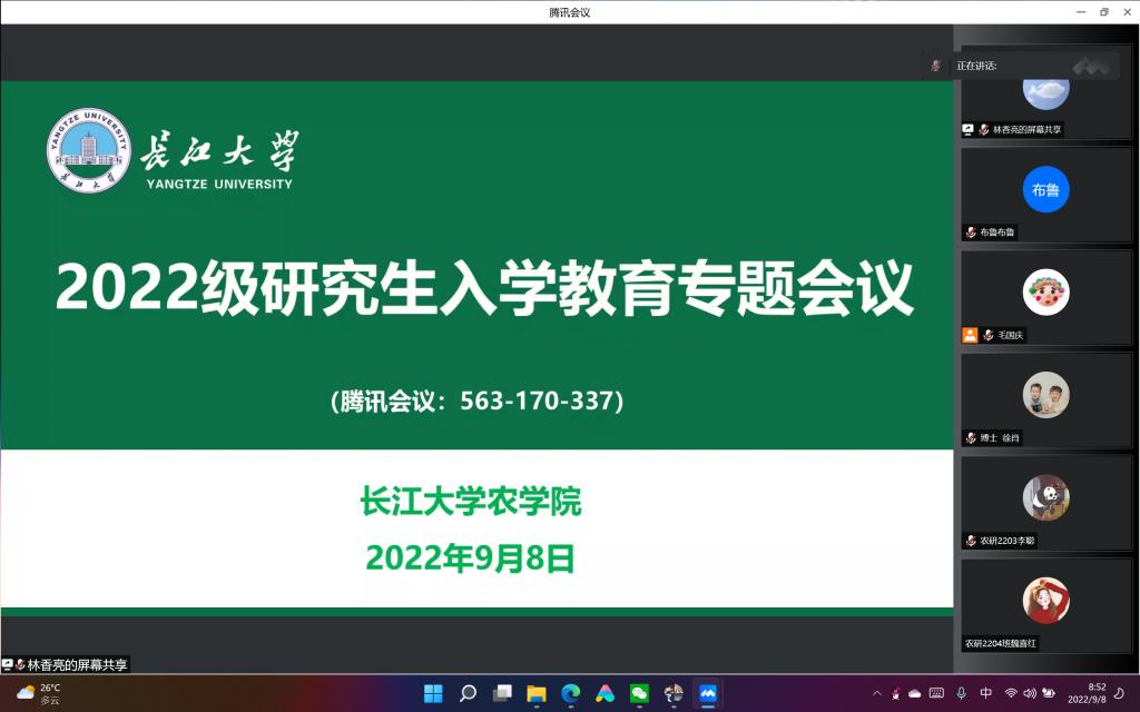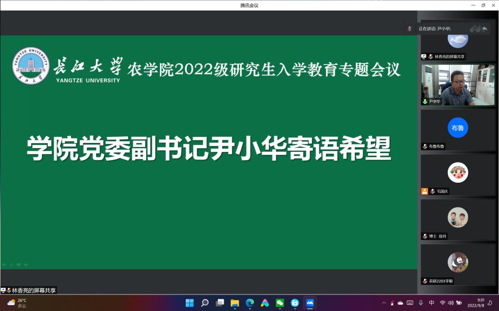 (通讯员 李秋红)为加强研究生新生思想政治教育,巩固当前疫情防控工作落实,帮助新生熟悉了解院史院情,9月8日上午,77779193永利官网召开2022级研究生入学教育专题会议。77779193永利官网党委副书记尹小华、兼职辅导员毛国庆、研究生会主席团成员参加,研究生辅导员林香亮主持会议。
