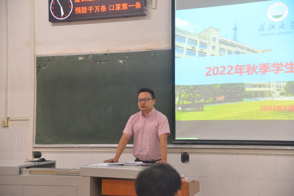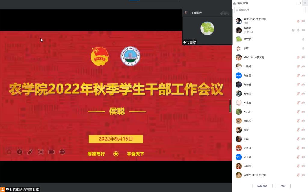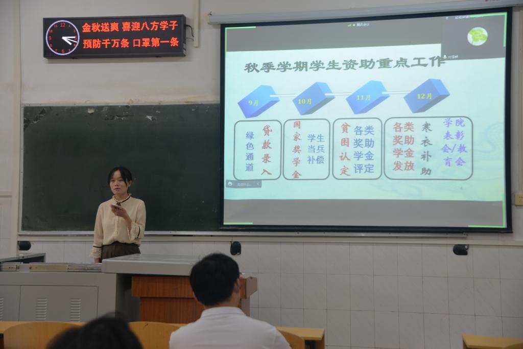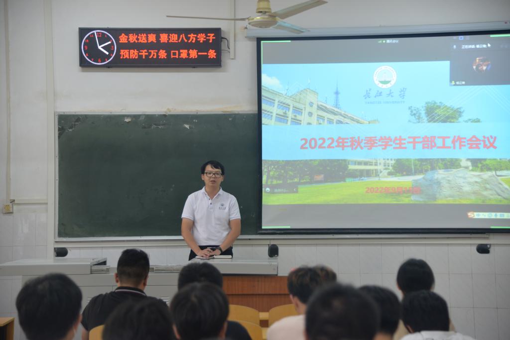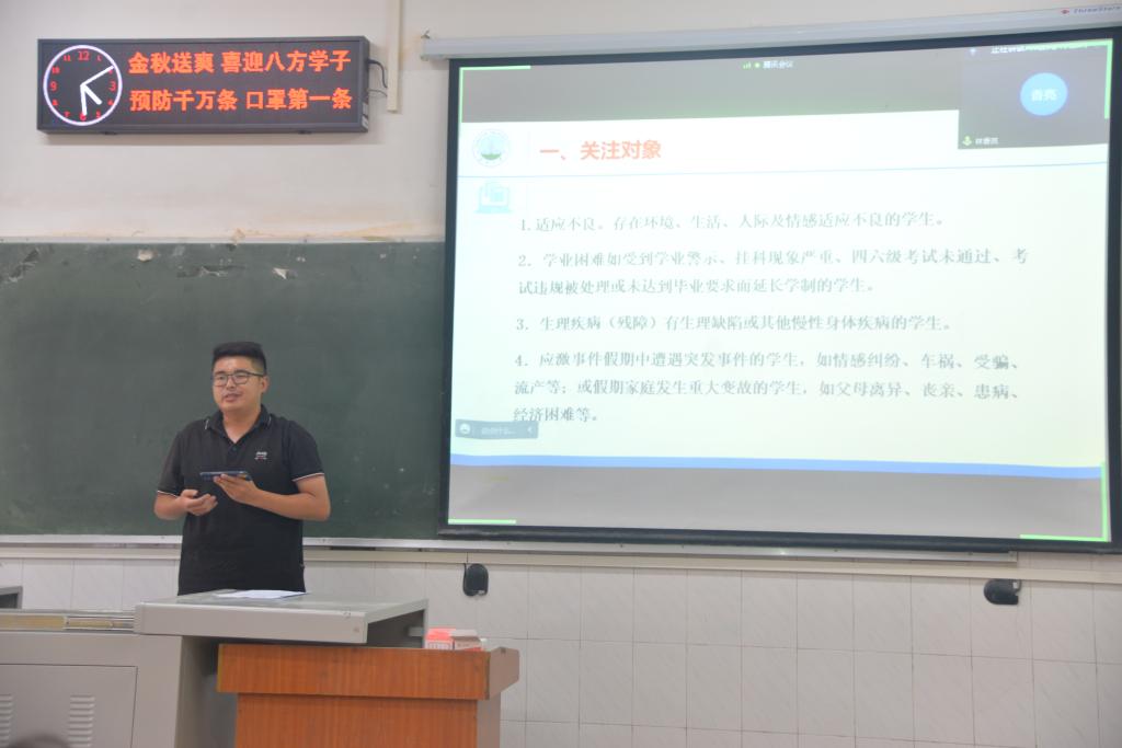 何忠万老师对就业工作进行介绍,希望学生干部能全力配合他的工作,一起将求职大赛圆满完成。现正逢一部分新生来校,杨云锋老师强调疫情防控不能松懈,要落实寝室-班级-学院-学校四级安全防范,还要做好全院的防电信诈骗工作,建设好学院的学风,做好宣传。