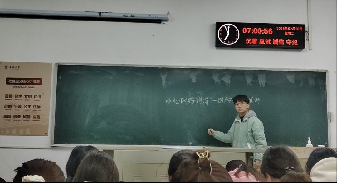 在互联网融入生活越来越深的今天,网络安全问题已然成为了高校安全法治教育的重头戏。农资32201班的陈文辉用一个个鲜活的真实事例,让我们看到了网络世界背后的灰暗——因轻信“网络刷单”、“网络兼职”等陷阱,被骗取个人财产,更有甚者用借贷来填“无底洞”,最终酿成了一桩桩令人惋惜的悲剧。他呼吁同学们利用好网络这把双刃剑,建立良好的防诈意识,提升鉴别网络陷阱的能力,构筑起学校网络安全的第一道防线。