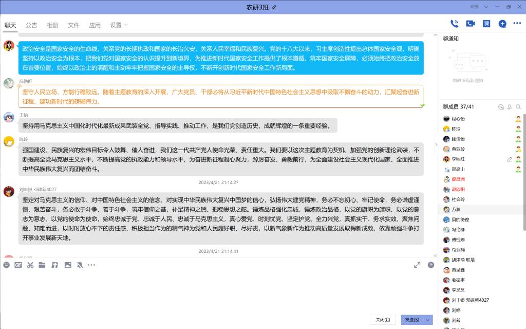 农研2103团支部李秋红分享道,学习习近平新时代中国特色社会主义思想是提高研究生政治素养、增强道路自信心和理论自信心的必修课;政治安全是国家安全的生命线,关系到党的长期执政和国家的长治久安,我们要始终把维护政治安全放在首位。”