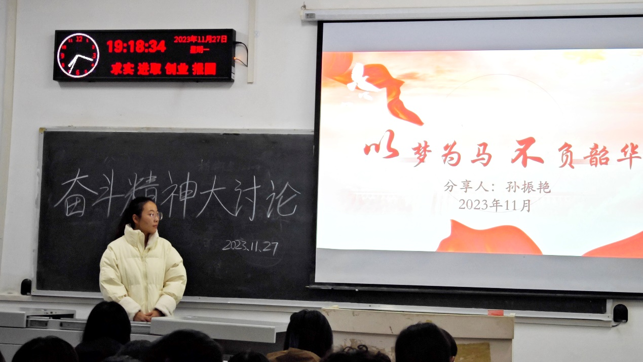 11月27日晚7点,植物类32303与植物类32304班在7教208联合开展此次“奋斗精神大讨论”活动,活动有幸邀请到辅导员唐玉婷老师、23届优秀毕业生孙振艳进行分享。对于刚步入大学两个多月的新生,唐老师鼓励他们保持永远奋斗的心态,向优秀的学长学姐学习;学习和奋斗是永无止境的,孙振艳学姐用大学四年的优秀事迹鼓舞大家不断拼搏、奔赴未来。听了老师和学姐的分享,同学们受益匪浅,也表示将继承并发扬革命先辈的革命精神,不忘初心、艰苦奋斗、不断前行,始终履行作为团员应该肩负的责任与担当,踔厉奋发,响应时代号召,积极投入到为中华民族伟大复兴的实践中去。