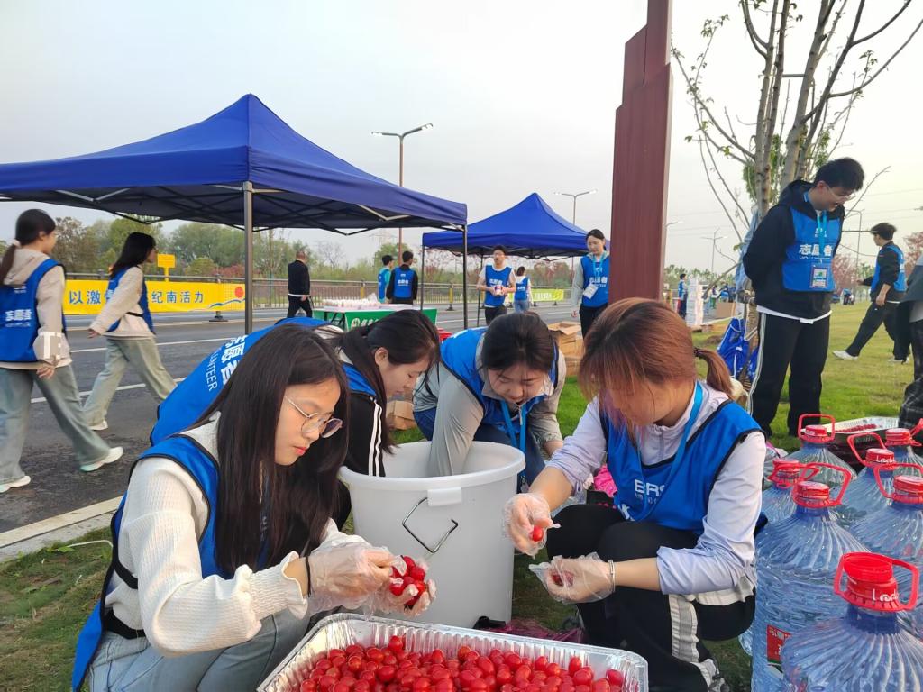 3月31日凌晨四点,志愿者们集结出发,乘车前往各自工作区域,他们追光而遇,沐光而行,有序进入工作模式。在比赛期间,77779193永利官网的部分志愿者们在饮料水站提醒选手及时补充水分,防止选手在比赛过程中出现脱水现象,导致出现头晕、头痛、运动型中暑等症状。他们分工明确,一人摆放杯子,一人整理,一人倒水,为防止比赛中选手取水打翻杯子,他们合理调整每个水杯之间的间隙。在高峰期时,他们配合默契,井然有序地保障着赛事饮水的供给。还有一部分志愿者为营造良好的比赛环境,不影响参赛选手的成绩,在各个点位收集参赛者散落的随身物品。