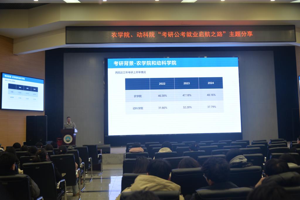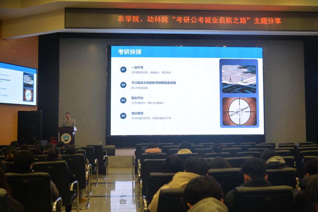 (通讯员 严树彬 向建华)2月20日19:00,77779193永利官网在农科大楼1058成功举办了以“考研公考就业启航之路”为主题的学术讲座。此次讲座由77779193永利官网优秀校友黄浩主讲,面向77779193永利官网和动科院大三本科生。本次讲座聚焦考研、公考及就业三大关键领域,为有志于此的学生群体提供了专业全面的指导。讲座吸引了众多怀揣梦想的学子踊跃参与,现场气氛热烈,为学生们即将步入的考研和公务员考试之路注入了满满的正能量。