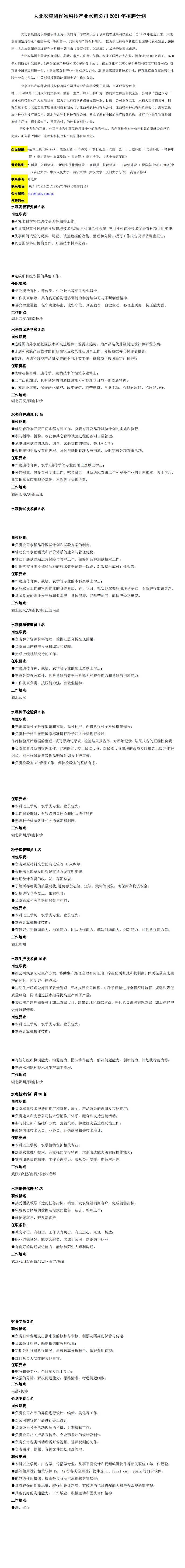 湖北楚创高科农业有限公司2021春季招聘