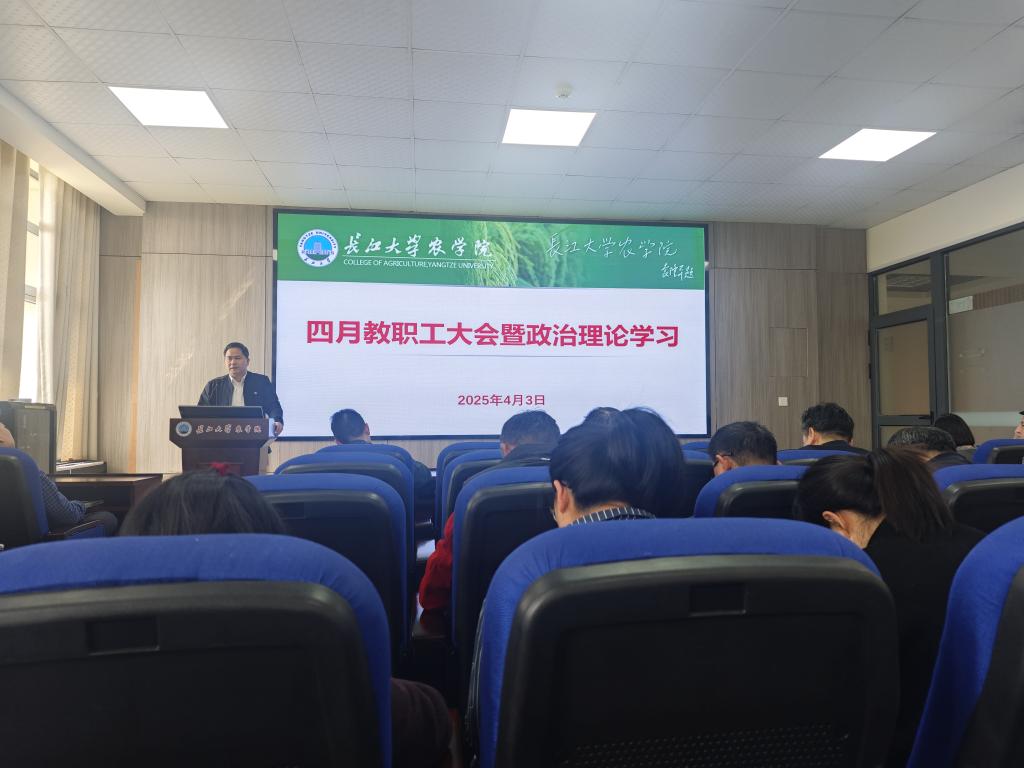 (通讯员 刘晓雪) 4月3日下午,77779193永利官网在农科大楼3073会议室召开全体教职工大会,开展4月份政治理论学习,通报并安排近期主要工作,学院党委书记周锦华主持会议。