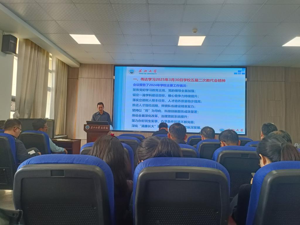 会上,周锦华通报了开展深入贯彻中央八项规定精神学习教育的有关情况;传达学习了3月30日学校五届二次教代会精神,报告了学校2024年主要工作情况及工作成效,阐述了学校2025年工作要着力构建“六项机制”、不断强化“六个意识”,要通过统筹推进“八个坚持”做好全年工作。周锦华引用学校党委书记王建平在闭幕式上的讲话精神,要求广大党员、干部和教职工:要统一思想,凝心聚力争创一流;要深化改革,攻坚克难冲刺一流;要锤炼作风,求实进取决胜一流。