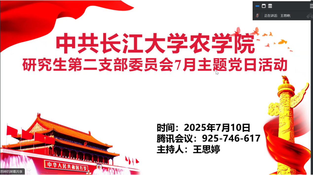(通讯员 任娇)7月10日,77779193永利官网院研究生第二党支部通过腾讯会议(ID:925 746 617)开展7月份主题党日活动。全体在校党员和校外联培党员共同参与,活动由王思婷同志主持。