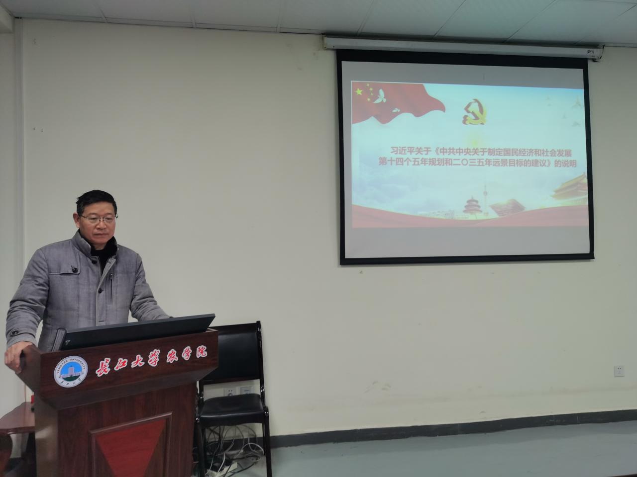 为全面贯彻十九届五中全会精神,深入学习十九届五中全会中的“新发展”理念,1224日下午3时,我院党委书记冯发明在农科大楼3073会议室给全体党员教师分享了学习贯彻党的十九届五中全会精神体会,对《国民经济和社会发展第十四个五年规划和二0三五年远景目标建议》进行全面解读。