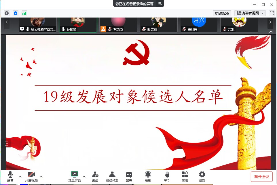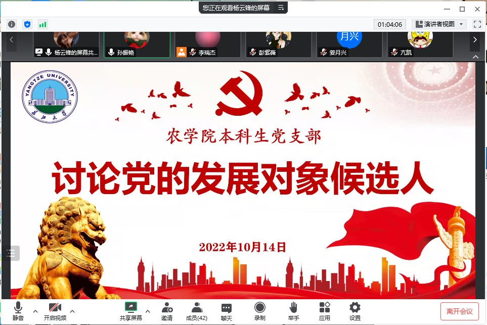 (通讯员 亢凯)为进一步加强学院党员队伍建设,切实提高发展党员质量,1014上午900,我院本科生学生党支部在腾讯会议召开2022年下半年党的发展对象候选人讨论活动由本科生学生党支部副书记唐海洋同志主持本科生学生党支部书记杨云锋同志和全体本科生党员参加了讨论会。