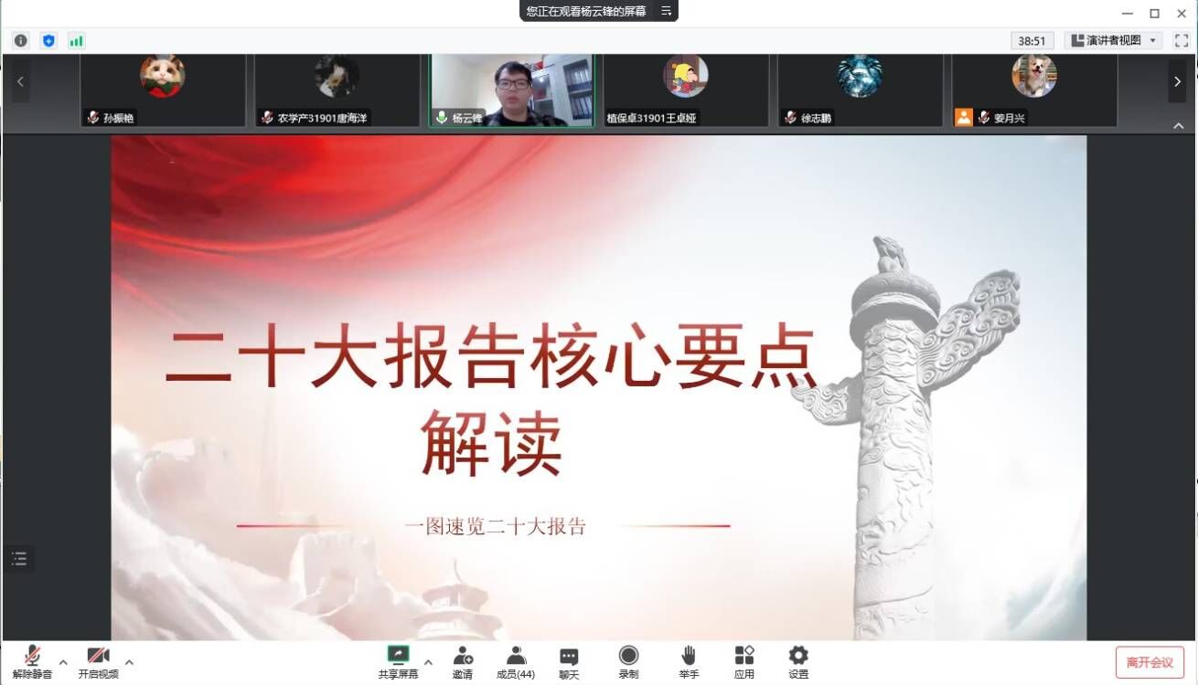 会议最后,支部书记杨云锋同志作总结发言云锋同志结合实际工作,寄语支部全体党员,要牢记习近平总书记的讲话精神,立志成为兴农爱农的新农科人才,牢牢端住中国人自己的饭碗,积极投身社会主义现代化建设,担当起复兴时代的大任。