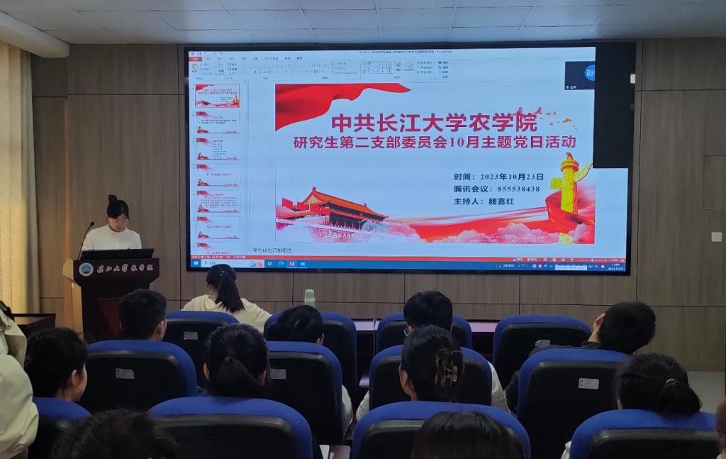 (通讯员 宋梦圆)10月23日下午3点,我院研究生第二党支部在农科大楼3071开展十月份主题党日活动,活动结合腾讯会议(ID:855 538 438)的方式同时在线上召开。全体在校党员和校外联培党员共同参与,活动由魏喜红同志主持。